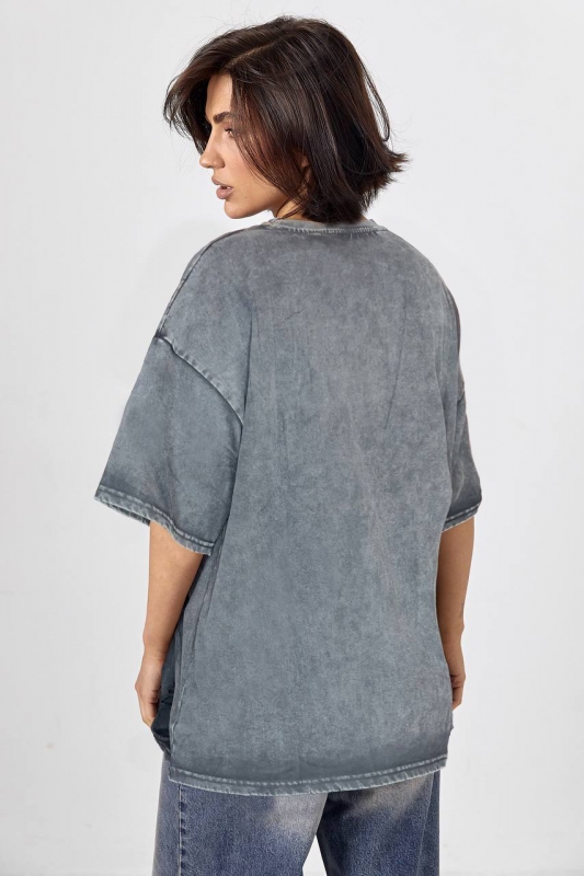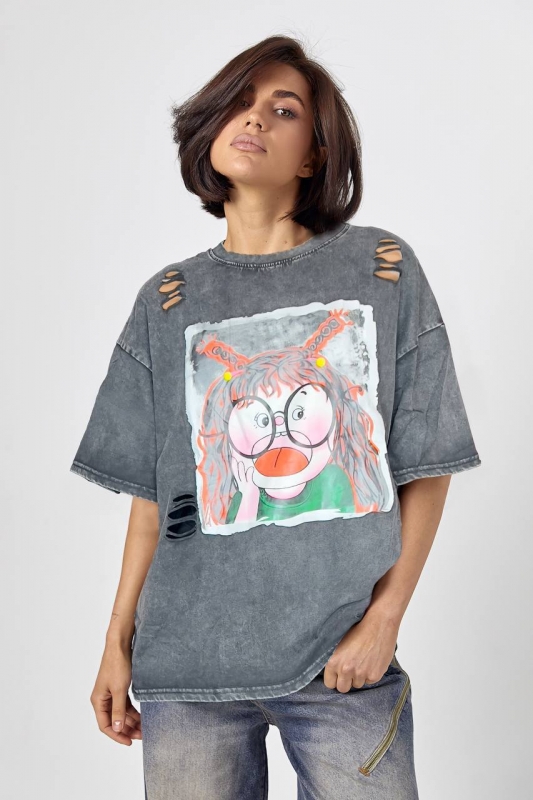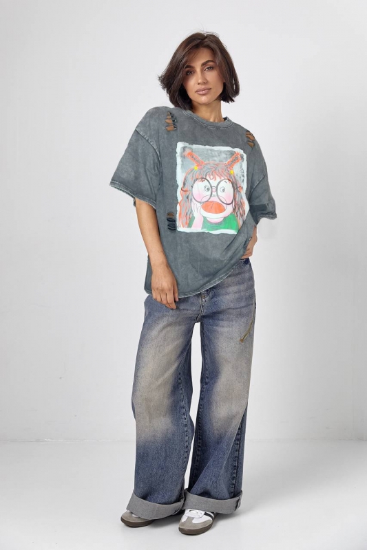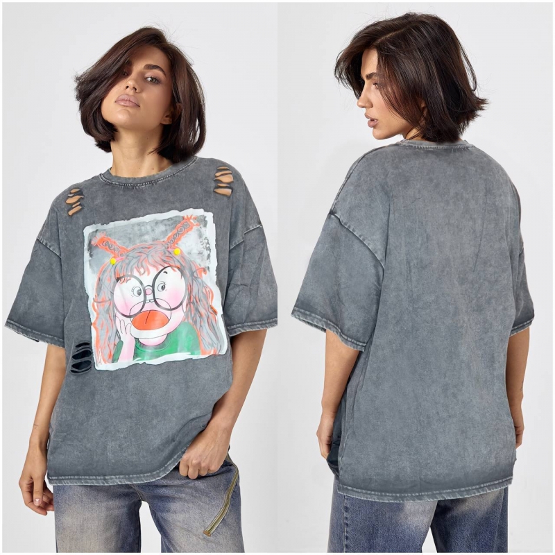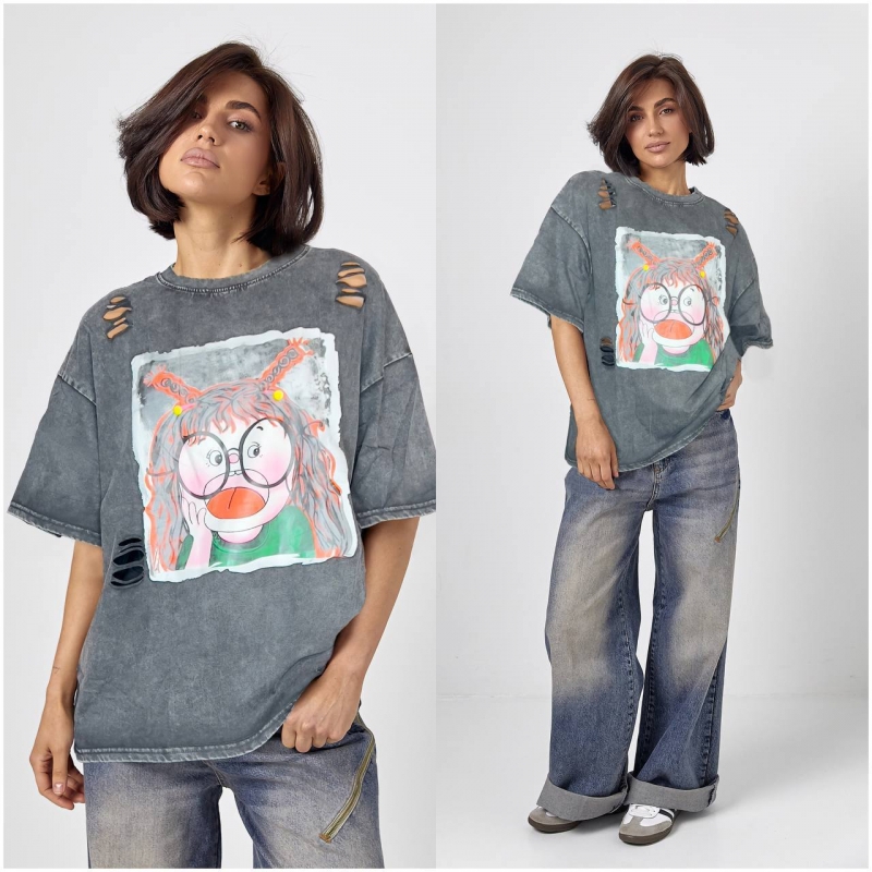 Стильна oversize футболка. Дизайн доповнений модними потертостями та прорізами на плечах і збоку,