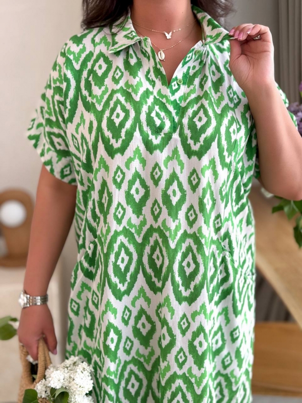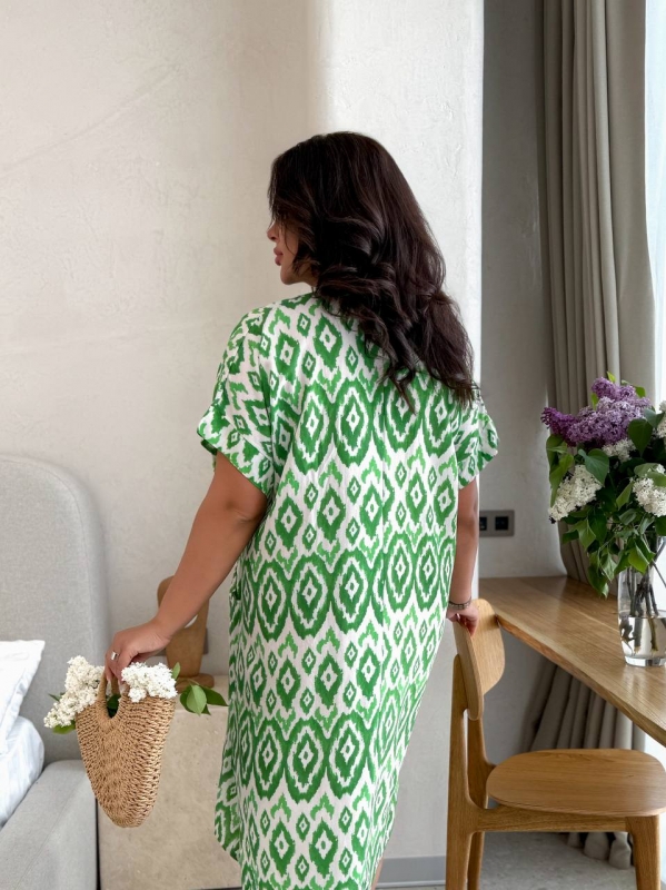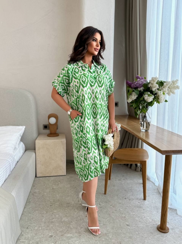 Літня сукня прямого силуету. Модель має відкладний комір і застібається спереду на ґудзики, що додає образу вишуканості.
